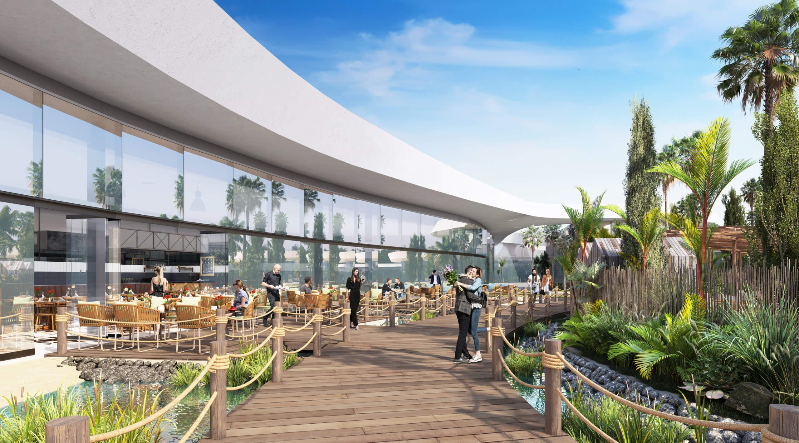 Oasiz Madrid también es pionero desde el punto de vista arquitectónico. El complejo ha sido diseñado como un espacio abierto, donde el aire, el agua y la vegetación se combinan con un diseño innovador y una arquitectura espectacular rodeada de jardines y hasta de un bosque.