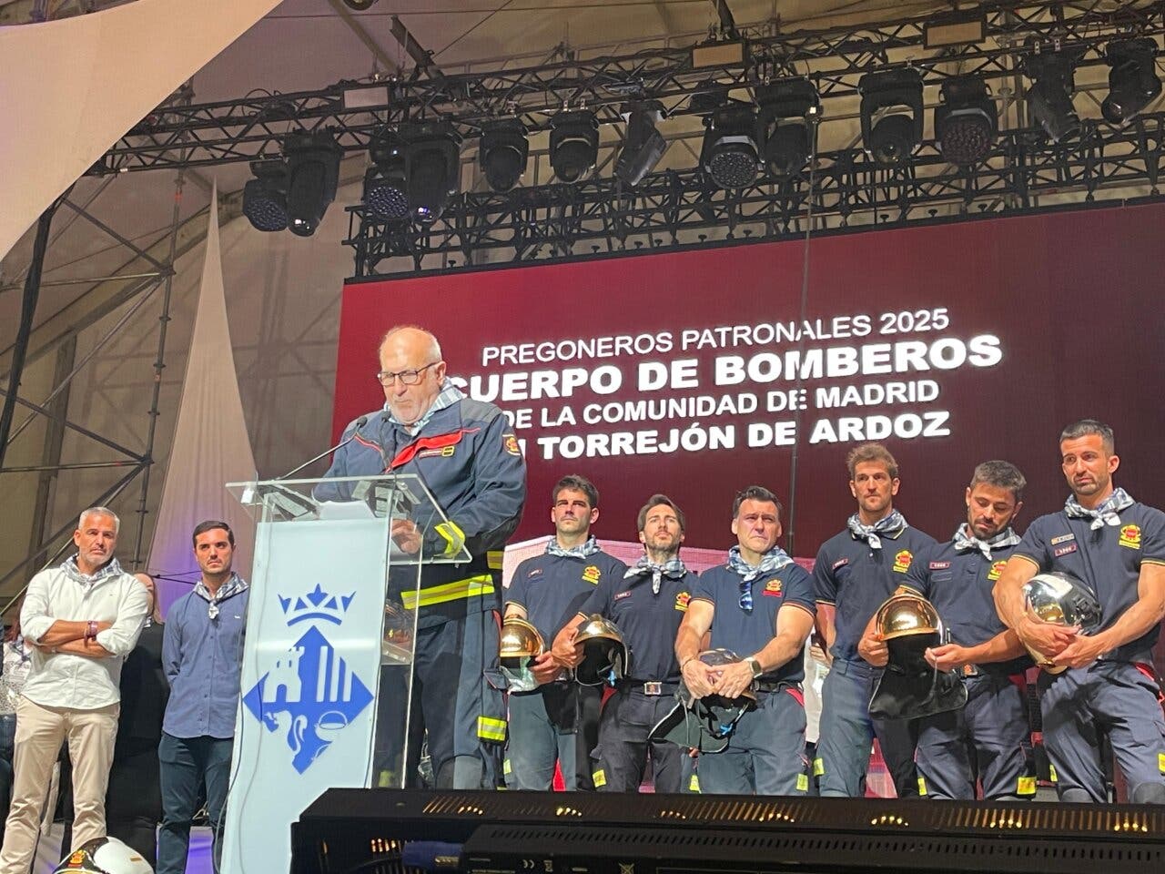 El pregón corrió a cargo del Cuerpo de Bomberos de la Comunidad de Madrid en Torrejón. Los bomberos recordaron a los compañeros que colaboraron en la DANA de Valencia y cerraron su intervención con un emocionado «¡Viva los bomberos y viva Torrejón!».
