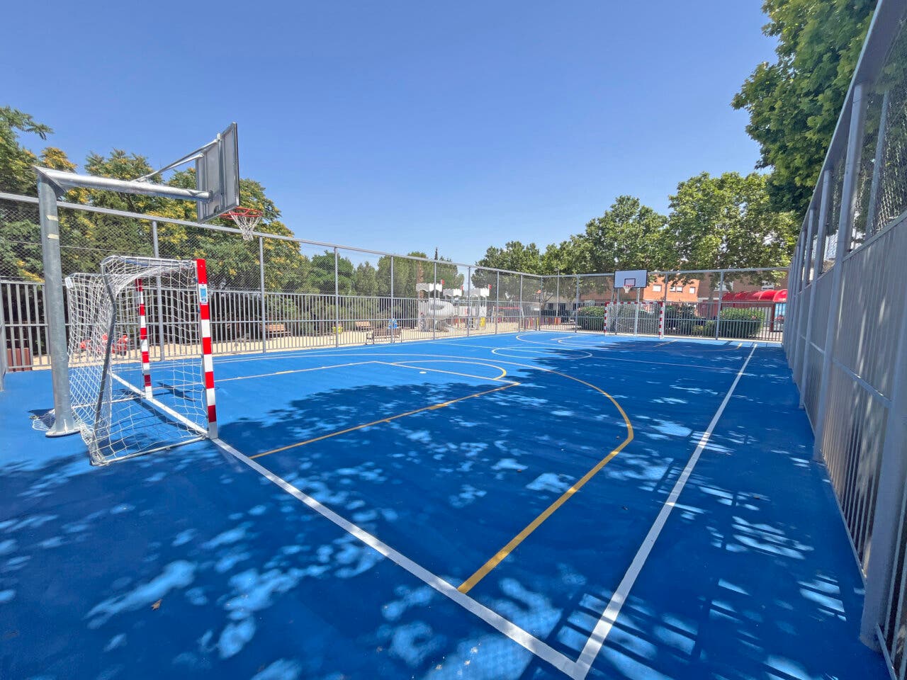La pista deportiva ha sido reacondicionada con nuevas porterías y canastas. Además, se ha renovado la malla de seguridad y se ha repintado tanto el pavimento como las líneas de juego.