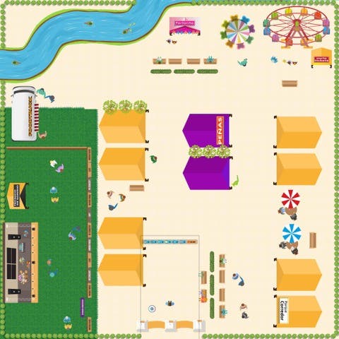 El recinto virtual torrejonero tiene, al igual que el real, seis ubicaciones en el juego: el escenario de los conciertos, la zona de atracciones, la zona del lago, las casetas de las peñas, las casetas institucionales (donde se encuentra en el juego la del propio centro comercial) y la zona de foodtracks. El jugador va superando distintas pruebas en las que tiene que llevar diferentes objetos a cada uno de estos lugares.