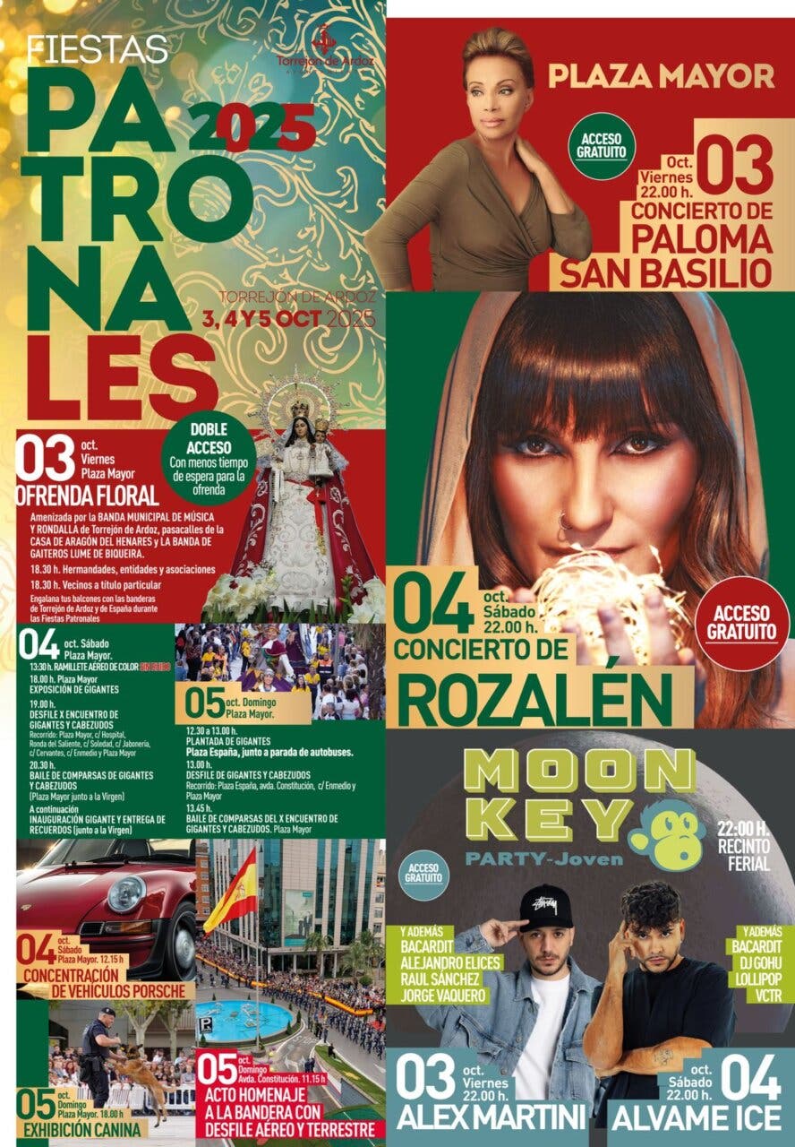 Las Fiestas Patronales de Torrejón de Ardoz se celebrarán del 3 al 5 de octubre con un programa que combina conciertos gratuitos y actos tradicionales. El alcalde, Alejandro Navarro Prieto, y la concejala de Igualdad y Festejos, María Eugenia Gil, han presentado la programación en el Museo de la Ciudad, donde también se inaugura una exposición fotográfica sobre los festejos.