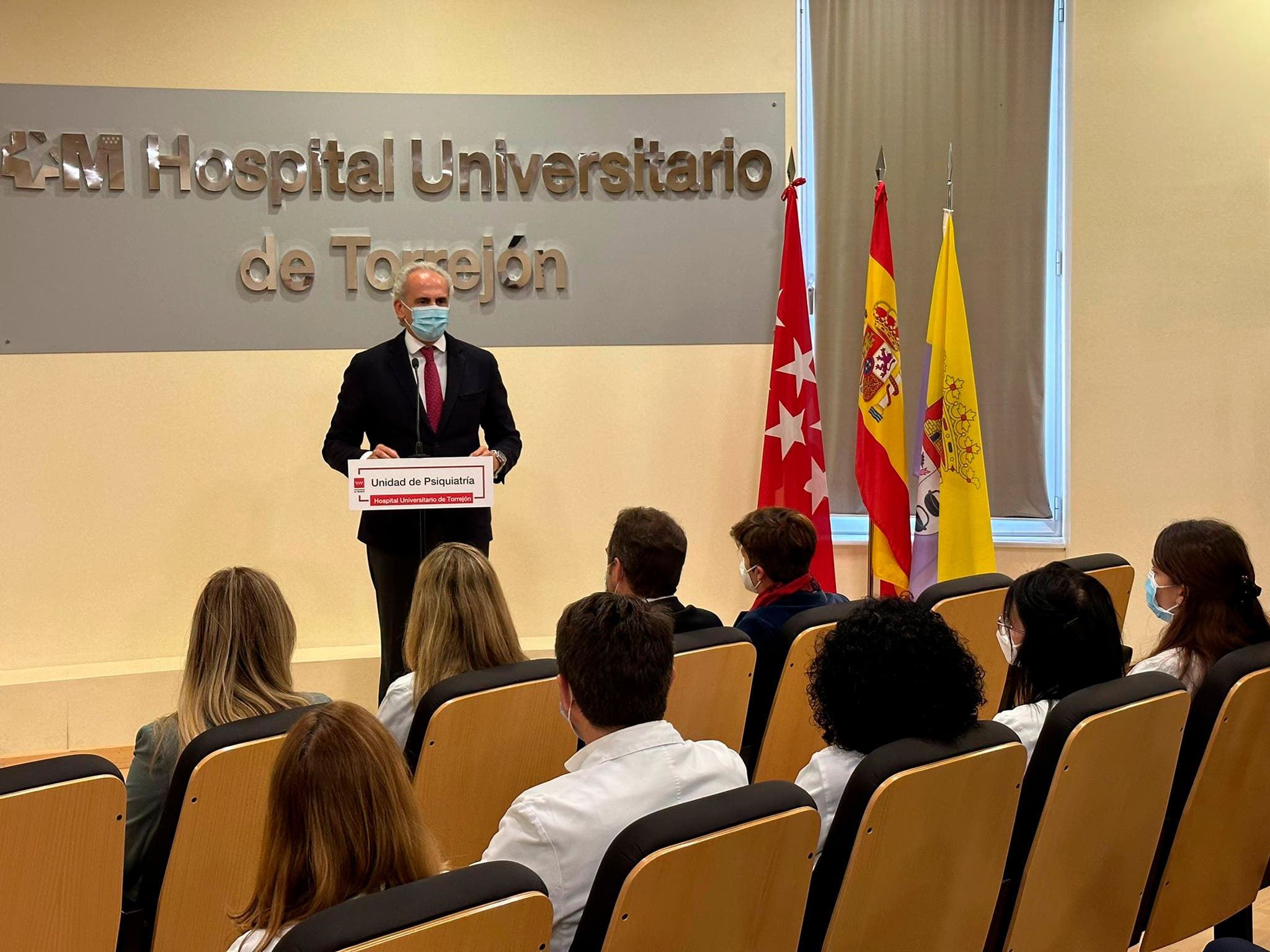 El consejero de Sanidad de la Comunidad de Madrid, Enrique Ruiz Escudero, ha acudido este viernes al Hospital Universitario de Torrejón para conocer la nueva planta de Hospitalización Psiquiátrica del centro y hacer balance de sus primeros meses en funcionamiento. Inaugurada en noviembre del 2022 con el objetivo de dar respuesta a las necesidades de salud de la población, ya ha recibido a cerca de 90 pacientes con enfermedades mentales.