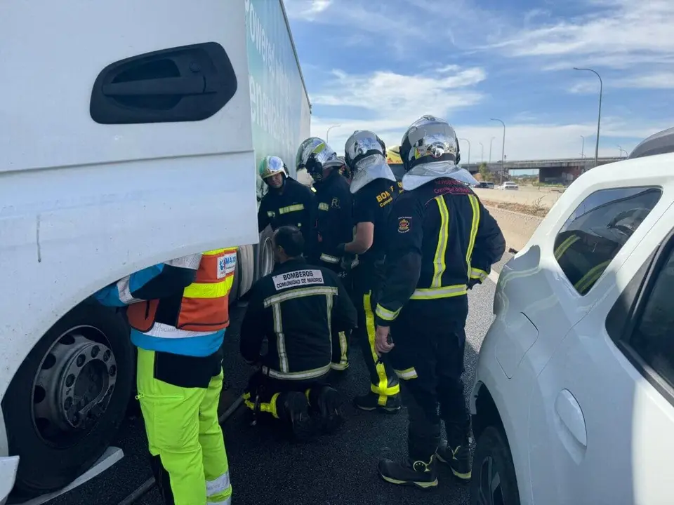 Los Bomberos de la Comunidad de Madrid han liberado a las conductoras de dos de los turismos que habían quedado atrapados. También han controlado un derrame de combustible del camión.