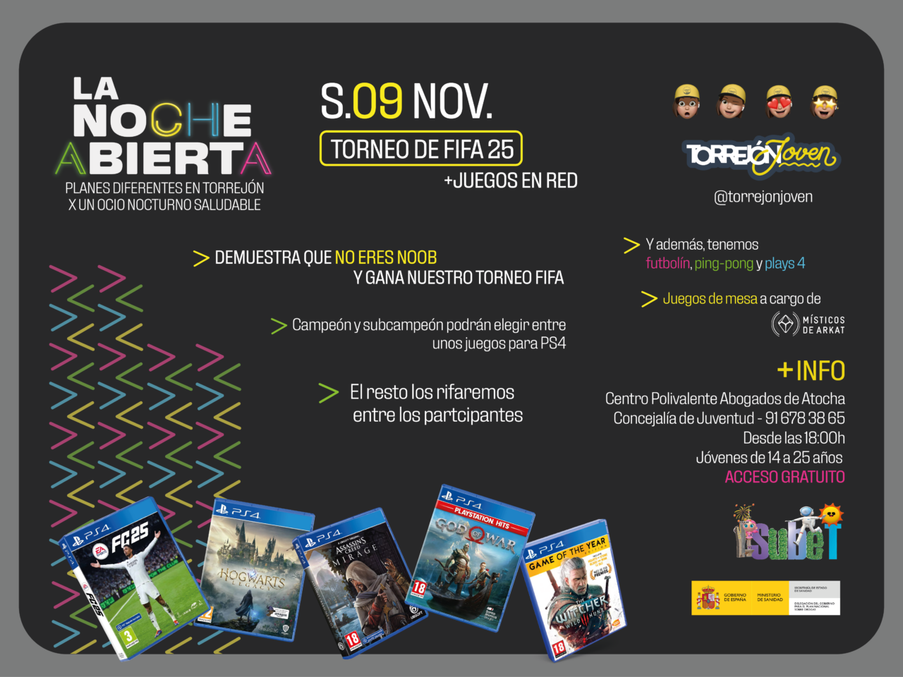La Noche Abierta es un programa con planes diferentes y gratuitos de ocio nocturno saludable para jóvenes de 14 a 25 años que se adaptan a todos los gustos y que tiene lugar los sábados a partir de las 18:00 horas en el Centro Polivalente Abogados de Atocha. A esta cita le seguirán nuevas actividades, como un monólogo y cócteles sin alcohol (16 de noviembre), un torneo de ping pong, con una exhibición de speedcubing y un taller de decoración (23 de noviembre) o el torneo Rocket League (30 de noviembre), entre otras.