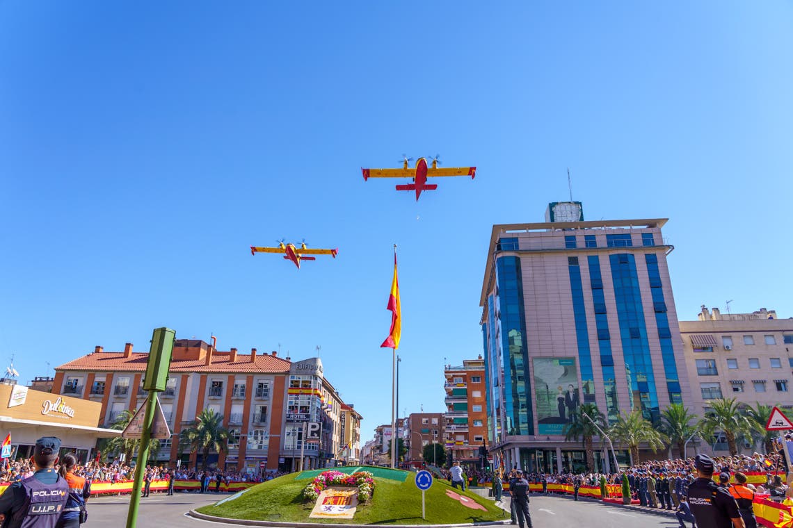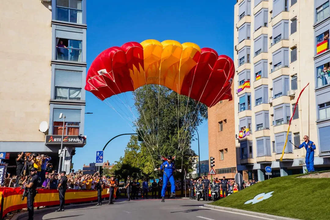 El acto comenzará a las 11:15 horas en la Plaza España, junto a la estación de Renfe. En él participarán la Base Aérea con dos cazas F18 y la UME, la Brigada Paracaidista (BRIPAC), y la Patrulla Acrobática de Paracaidistas del Ejército del Aire (PAPEA).