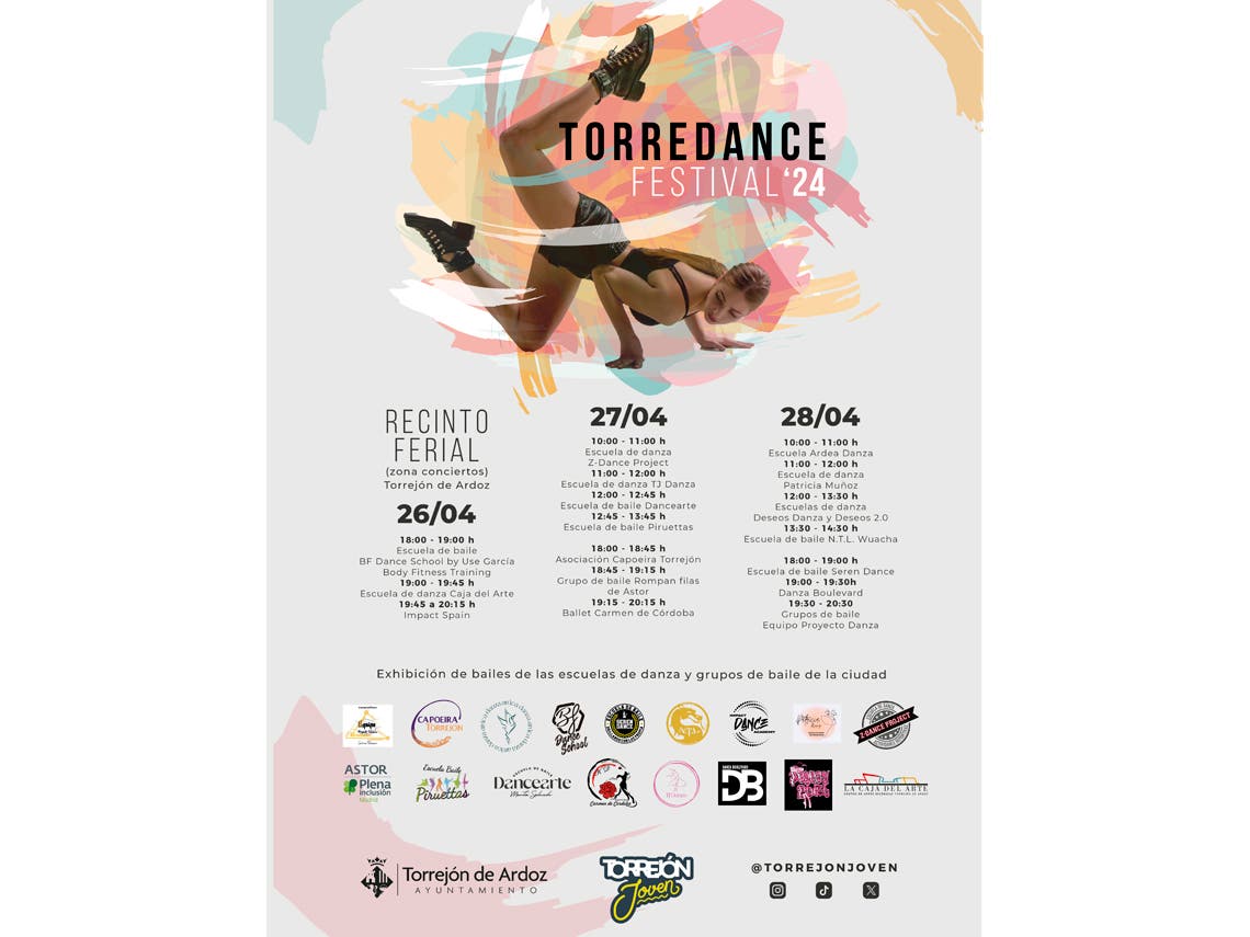 Torredance dará su pistoletazo de salida este viernes, 26 de abril, a las 18:00 horas, con la Escuela de Baile BF Dance School by Use García Body Fitness Training, mientras que a las 19:00 horas será el turno de la Escuela de Baile Caja del Arte y la jornada finalizará con Impact Spain, a las 19:45 horas.