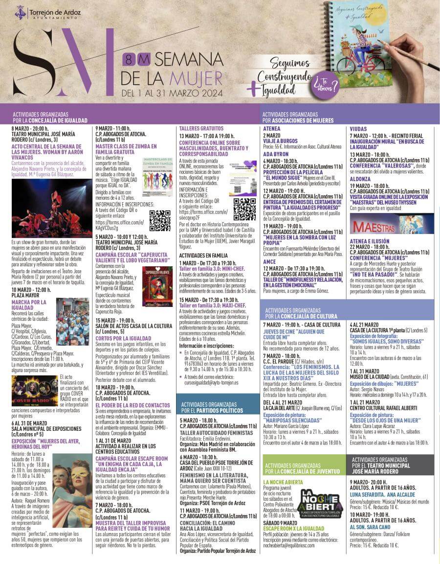 Además, se podrá participar en los talleres en familia 3.0. Mini Cheef, donde se visualizará que las tareas domésticas nos corresponden a todos; los cortos por la igualdad; o la actividad para emprendedoras El poder de la red de contactos. Los diferentes talleres gratuitos, las actividades que organiza la Concejalía de Cultura, sin olvidar las realizadas por las asociaciones de mujeres de Torrejón (Atenea, Asociación de Mujeres Ada Byron, AMCE, Asociación Viudas, Aldonza y Grupo Teatro Ilusión), y las de los diferentes partidos políticos, completan el amplio programa de la Semana de la Mujer. Toda la programación se puede consultar en la web municipal (www.ayto-torrejón.es) y en el folleto que recoge todas las actividades.