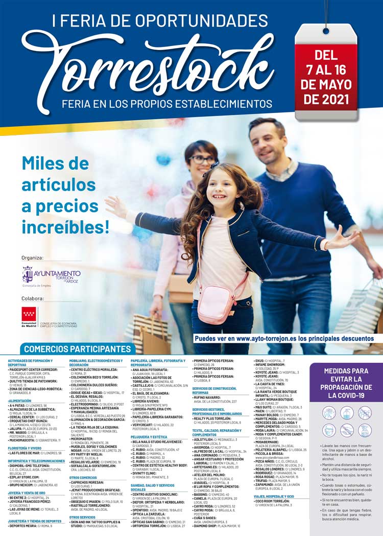 Torrejón de Ardoz celebra del 7 al 16 de mayo su I Feria de Oportunidades Torrestock con importantes descuentos y ofertas en más de 100 comercios. Gracias a esta iniciativa, los vecinos podrán disfrutar de grandes promociones y rebajas en los más de 100 comercios participantes en el horario comercial de cada establecimiento.