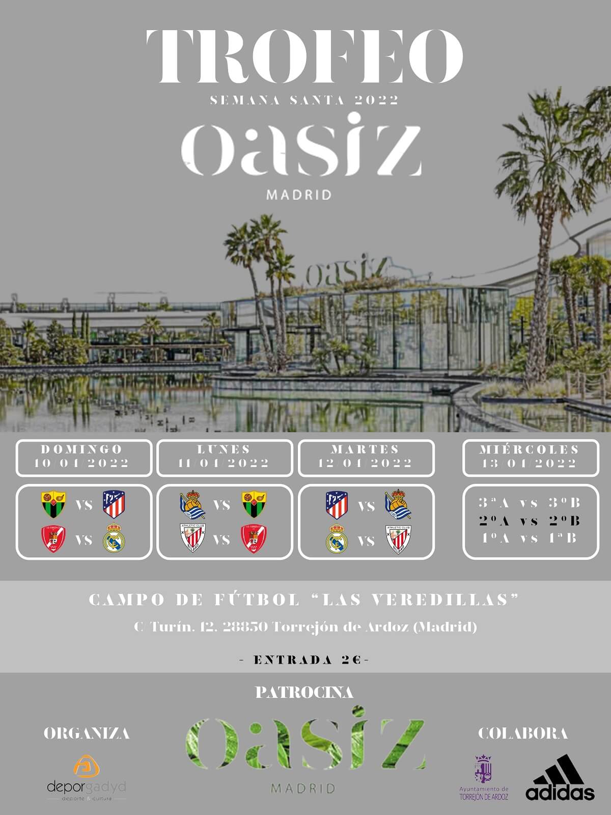 Del 10 al 13 de abril, el Campo de Fútbol Municipal Las Veredillas, acogerá el Trofeo Oasiz en el que participarán algunos de los mejores equipos de nuestro país de categoría infantil como son el Real Madrid, Atlético de Madrid, Athletic de Bilbao y Real Sociedad. Completan el cartel dos de las mejores canteras de la Comunidad de Madrid, la AD Torrejón CF y el Periso CF.