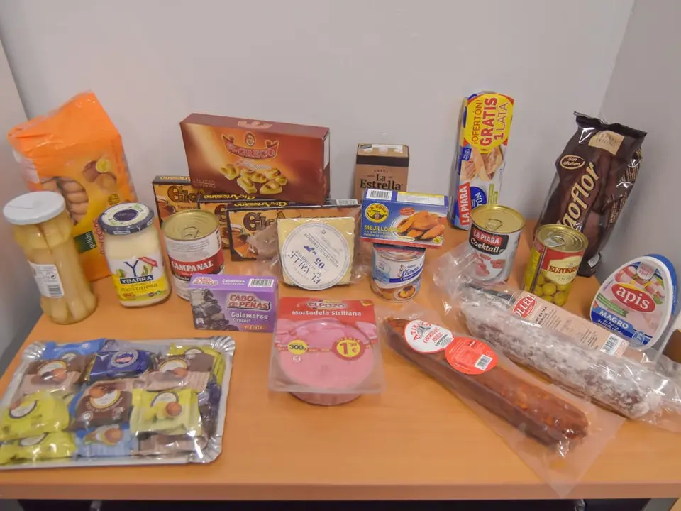 Las cestas están compuestas por un surtido de género navideño, además de café, cacao, leche condensada, bizcochos, un tarro de espárragos, un bote de mahonesa, una barra de fuet y otra de chorizo y salchichón, una lata de magro de cerdo, un bote de fabada, fiambres, queso, una lata de mejillones, salchichas, aceitunas, calamares y paté de pescado. Asimismo, se les ha entregado paquetes de puré de patata, 500 kilos de azúcar, 500 kilos de harina. 500 cajas de porciones de quesitos y 100 botes de cacao soluble.