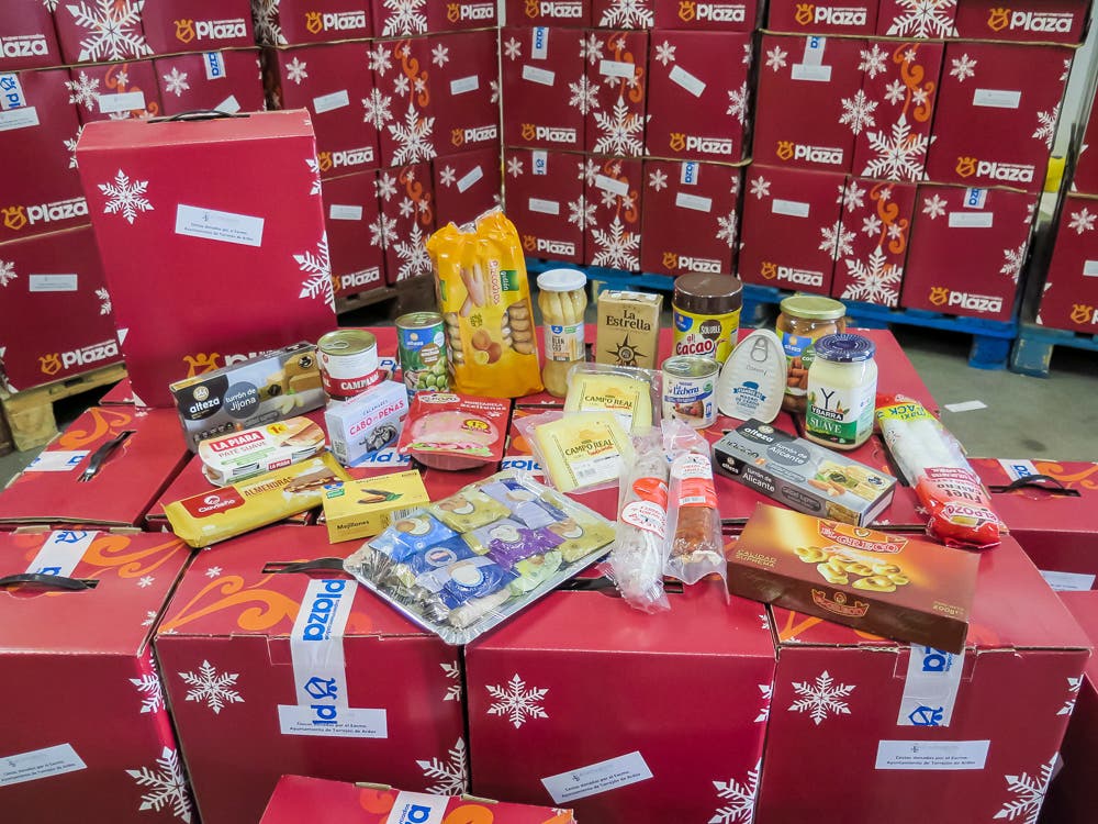 Unas cestas que están compuestas por un surtido de género navideño, además de café, cacao, leche condensada, bizcochos, un tarro de espárragos, un bote de mahonesa, una barra de fuet y otra de chorizo y salchichón, una lata de magro de cerdo, un bote de fabada, fiambres, queso, una lata de mejillones, salchichas, aceitunas, calamares y paté de pescado. Asimismo, se les ha entregado 400 kilos de harina, 405 kilos de arroz y 408 botes de garbanzo cocido.