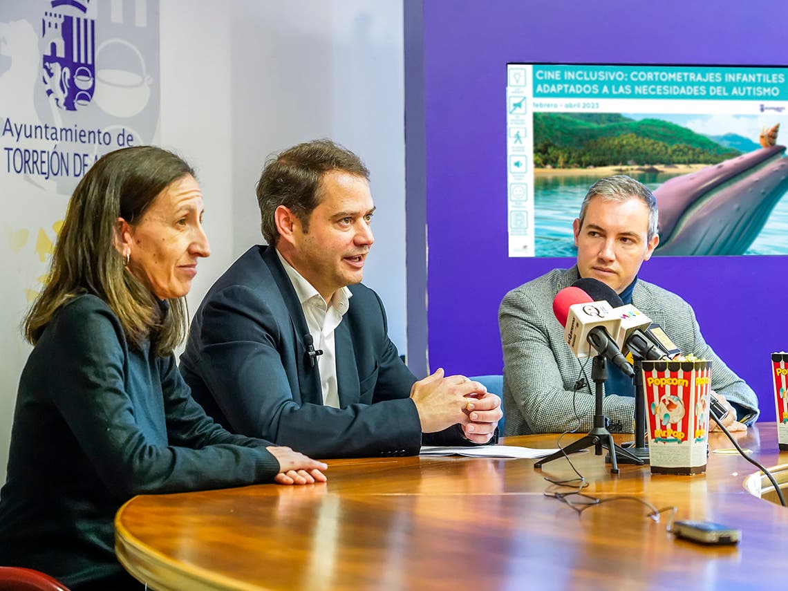 El alcalde de Torrejón de Ardoz, Ignacio Vázquez, y el concejal de Bienestar, Educación e Inmigración, Rubén Martínez, acompañados por la jefa de estudios del centro educativo de Virgen de Loreto de la Asociación de Padres de Hijos con Discapacidad Intelectual de Torrejón (ASTOR), María Solís, han presentado esta mañana #venTEAlcine, una iniciativa pionera en la ciudad de cine adaptado para para personas con trastorno del espectro autista (TEA) y sus familias.