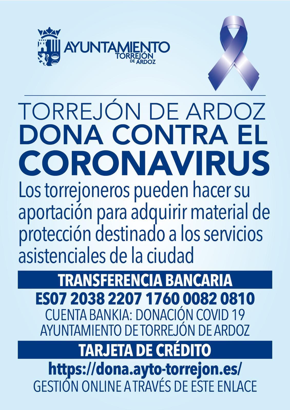 El Ayuntamiento de Torrejón de Ardoz ha puesto en marcha la campaña de recogida de aportaciones económicas Torrejón de Ardoz dona contra el coronavirus, ante las numerosas propuestas de vecinos que desean hacer donaciones. El objetivo es seguir adquiriendo material de protección para los servicios asistenciales y también para todos los torrejoneros.