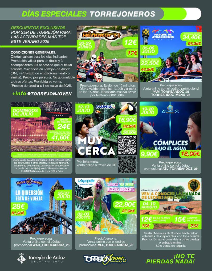 Además, entre el 4 y el 10 de agosto, Safari Madrid aplicará precios reducidos para vecinos empadronados. Las entradas costarán 12 euros para niños de 3 a 10 años y 15 euros para mayores de 11. Los menores de 3 años entran gratis. La compra deberá hacerse en taquilla y será necesario acreditar la residencia en Torrejón.