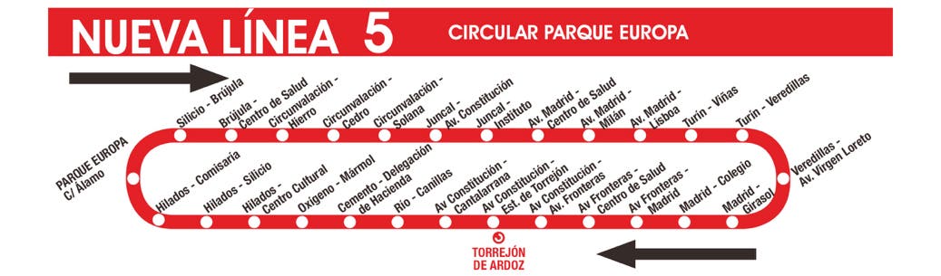 - Nueva línea 5: L5 Circular Parque Europa. Esta nueva línea en doble sentido recupera la antigua circular con la ampliación de su trayecto hasta el Parque Europa.