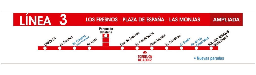 - Línea 3: L3 Los Fresnos-Plaza de España-Las Monjas. Se mantiene el recorrido y se amplía en el Polígono Industrial Las Monjas con paradas en la calle Otoño y Avenida de las Estaciones. Además se incorpora una segunda parada en Av. de los Fresnos, frente a los Pisos Tutelados.