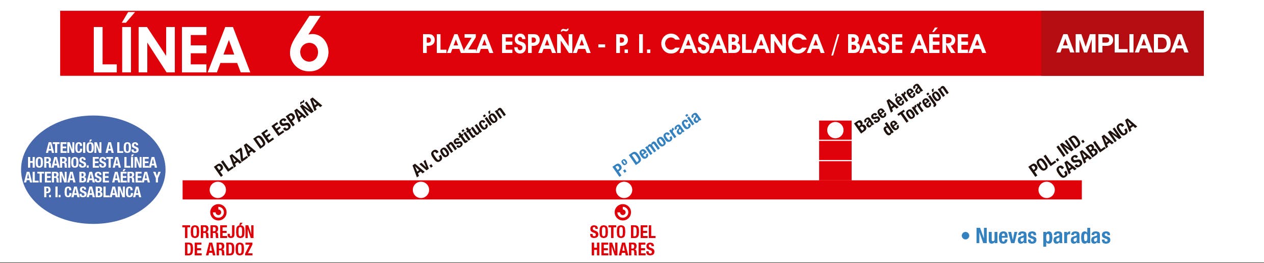 - Línea 6: L6 Plaza de España-P.I. Casablanca/Base Aérea. Se amplía el recorrido y esta línea parará en la Estación de Tren de Soto del Henares y en el Polígono Industrial Casablanca manteniendo el recorrido hasta la Base Aérea. Se recomienda consultar los horarios en el teléfono 012 o en la web del Consorcio de Transportes porque esta línea alterna su finalización de trayecto.
