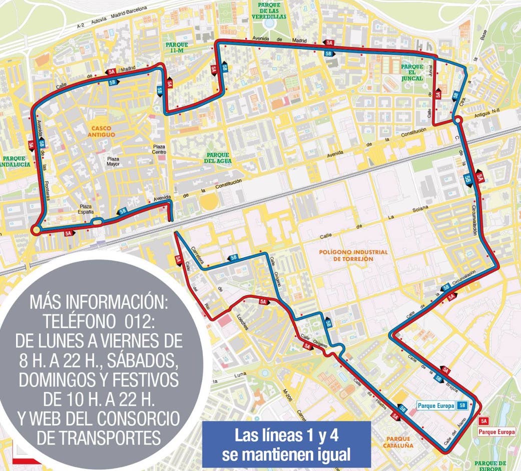 El Ayuntamiento de Torrejón de Ardoz, en colaboración con el Consorcio Regional de Transportes de la Comunidad de Madrid, ha llevado a cabo un importante plan de remodelación de las líneas de autobuses urbanos de Torrejón que supone la creación de una nueva línea, la L5 Circular Parque Europa en doble sentido, que recupera el trayecto de la antigua circular y lo amplía hasta el Parque Europa.. Además, se ha ampliado el recorrido de las líneas 2, 3 y 6, incorporando nuevas paradas. Las líneas 1 y 4 se mantienen igual.