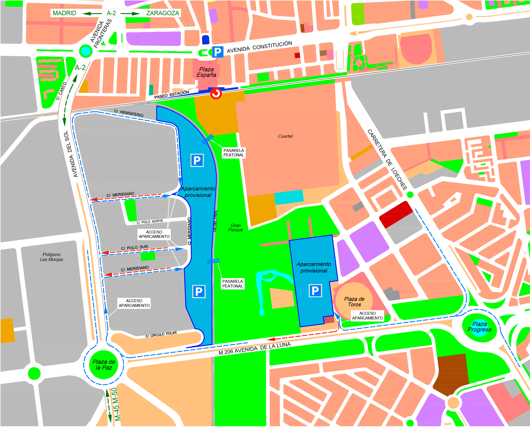 El gran aparcamiento provisional principal, conocido como el de las Fiestas Populares, tiene 2.000 plazas, nueva iluminación y compactación. Y el segundo se sitúa en el mercadillo, junto a la zona de conciertos y tiene 1.500 plazas. Este segundo estará disponible durante todas las Navidades excepto los miércoles por la mañana, ya que ahí se instalará el mercadillo.