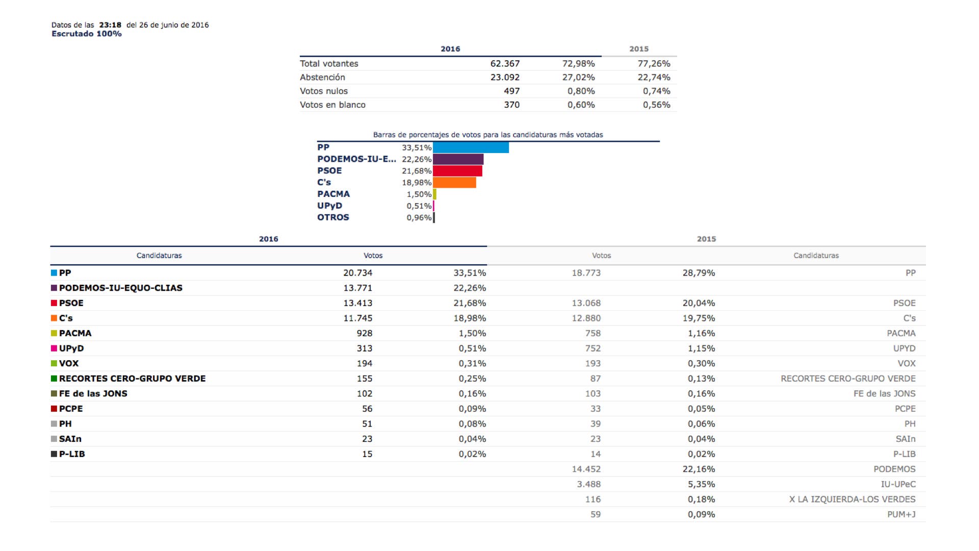 El PP ha obtenido 20.734 votos, lo que representa el 33,51 por ciento del total, frente a Unidos Podemos, que ha logrado 13.771 sufragios, lo que supone el 22,26 por ciento de los apoyos.