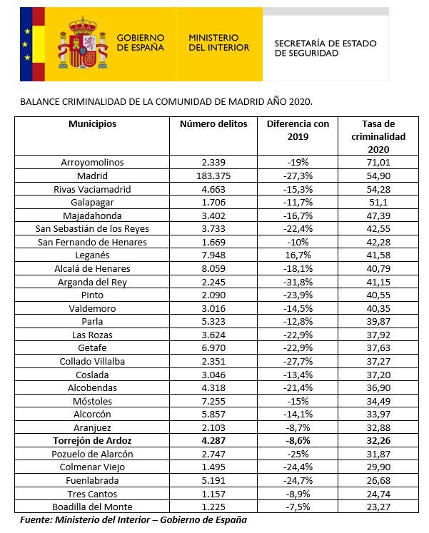 Además, de los 27 municipios de más 30.000 habitantes de la Comunidad de Madrid, Torrejón de Ardoz fue el sexto con menor tasa de criminalidad en 2020.