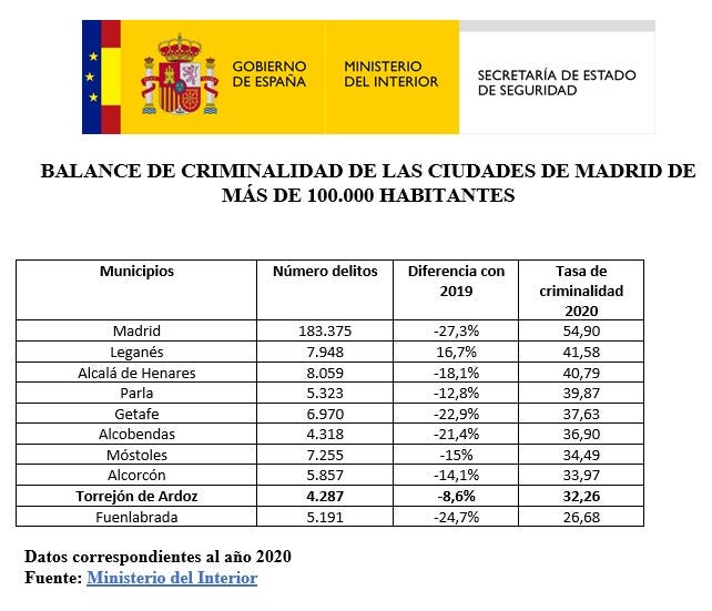Según datos del Ministerio de Interior del Gobierno de España, Torrejón de Ardoz se mantuvo en 2020 entre las ciudades con una tasa de criminalidad más baja de Comunidad de Madrid.