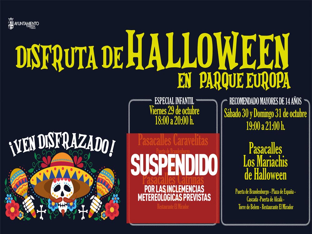 En caso de que pueda realizarse, mañana sábado 30 y el domingo 31 de octubre tendrá lugar el Pasacalles Los Mariachis de Halloween, recomendado para mayores de 14 años, entre las 19:00 y las 21:00 horas. Se realiza con la colaboración de la Comparsa de Gigantes y Cabezudos de Torrejón de Ardoz, y desfilará por la Puerta de Brandenburgo, Plaza de España, Cascada, Puerta de Alcalá, Torre de Belem y Restaurante el Mirador.