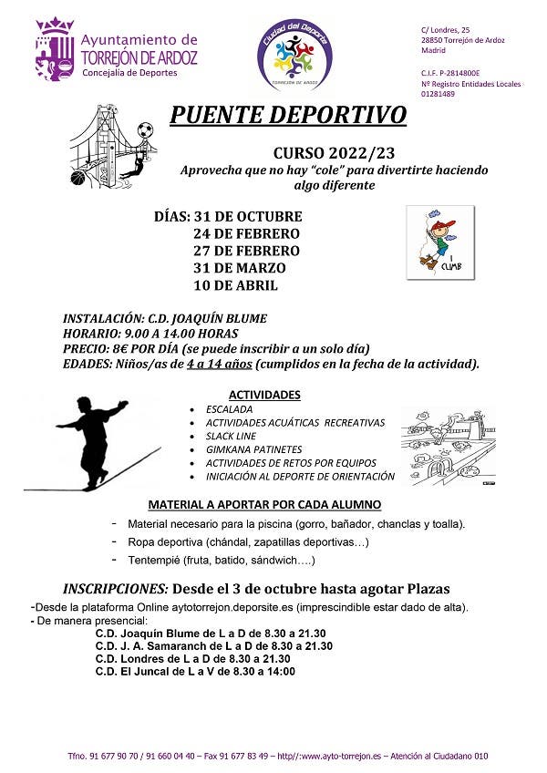 «Aprovecha que no hay cole para divertirte haciendo algo diferente» es es la premisa principal del programa Puente Deportivo, que está dirigido a menores de 4 a 14 años y se desarrolla en la Ciudad Deportiva Joaquín Blume. Allí, los participantes realizarán diferentes actividades como escalada, slackline (deporte de equilibrio), retos por equipos, gimkana de patinetes, etc.