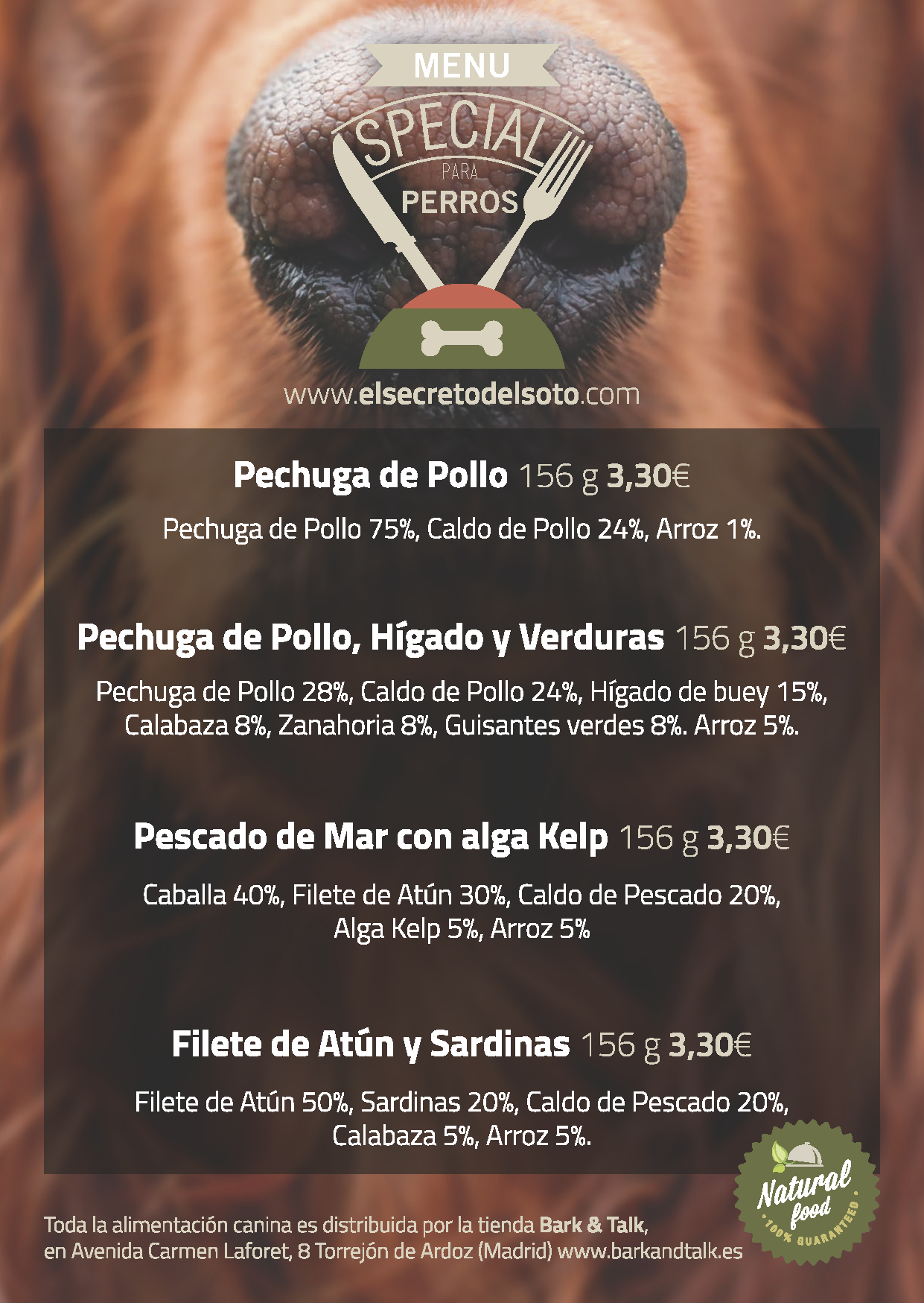 El Secreto del Soto, en el barrio de Soto del Henares, en Torrejón de Ardoz (Paseo de la Democracia s/n) lleva unos años ofreciendo un original servicio para las mascotas, los dueños de los perros pueden ir a comer o a cenar mientras el animal disfruta de un menú perruno 100% natural.