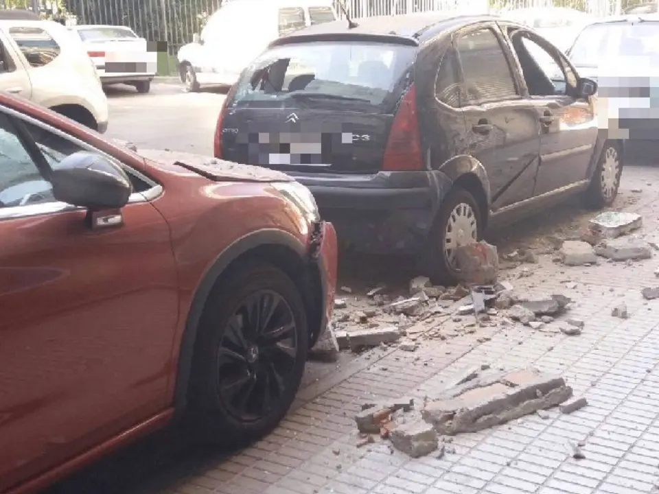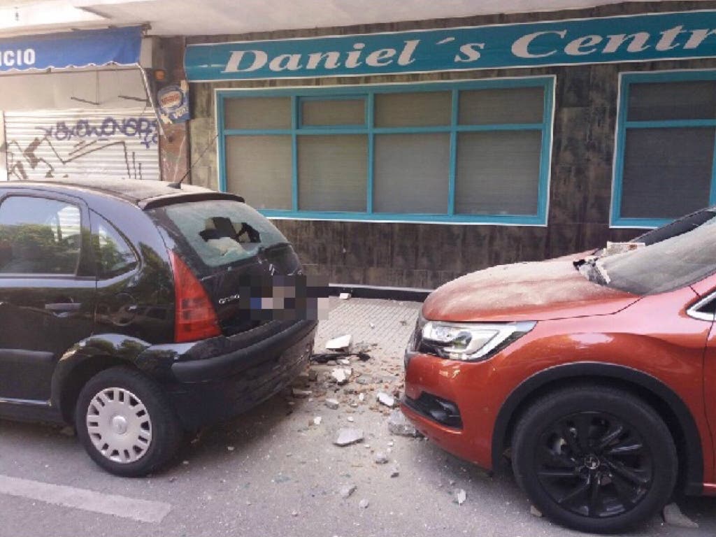 Afortunadamente no ha habido que lamentar heridos pero sí importantes daños materiales en los vehículos que en ese momento había aparcados en la calle, y que han quedado envueltos en cascotes.