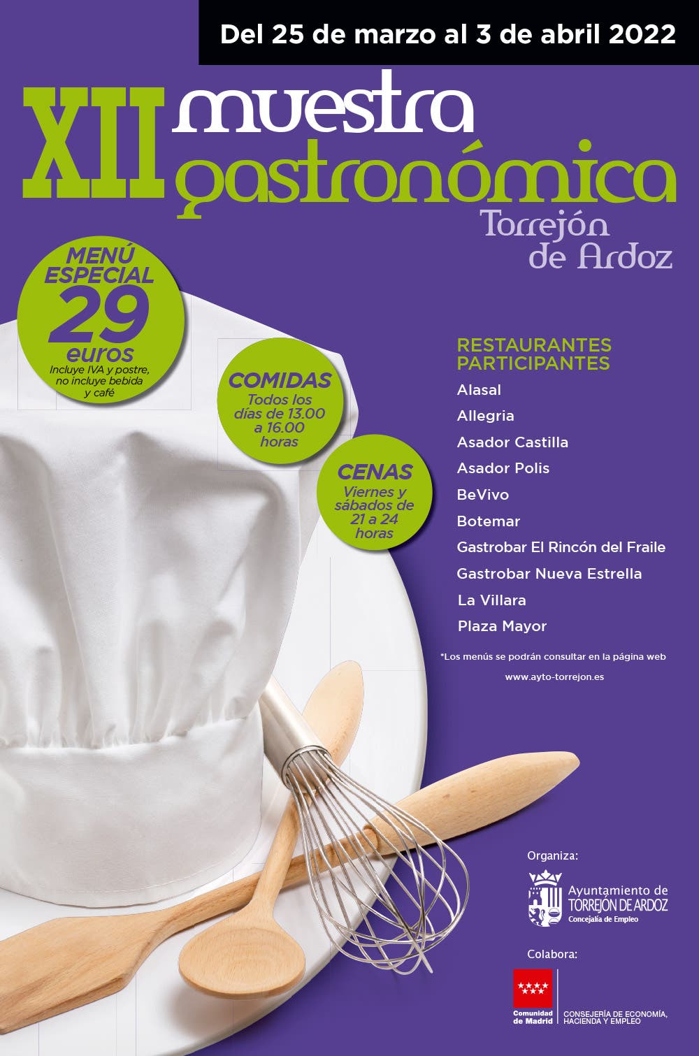 Del 25 de marzo al 3 de abril vuelve la Muestra Gastronómica de Torrejón de Ardoz que ofrecerá menús de alta cocina a 29 euros (con IVA y postre incluidos) y que abarcará dos fines de semana.