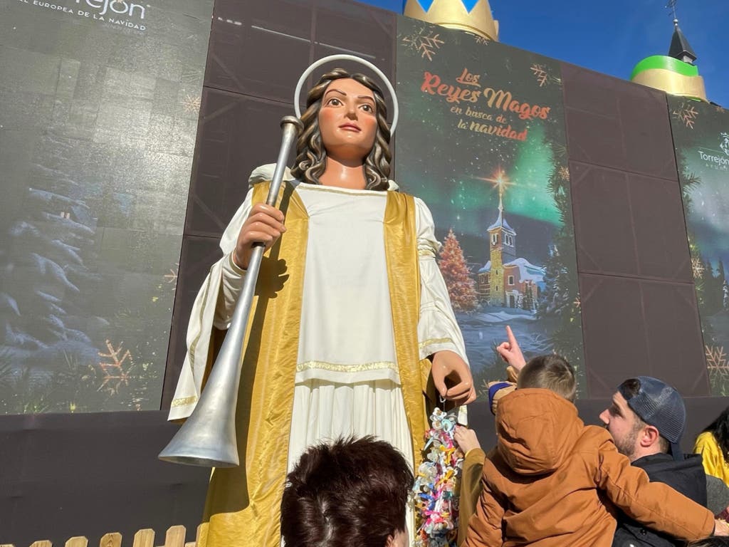 Un año más, el ángel Raguel, de la Comparsa de Gigantes y Cabezudos de Torrejón de Ardoz, vuelve para recoger los chupetes de los niños que quieran entregárselos a los Reyes Magos.