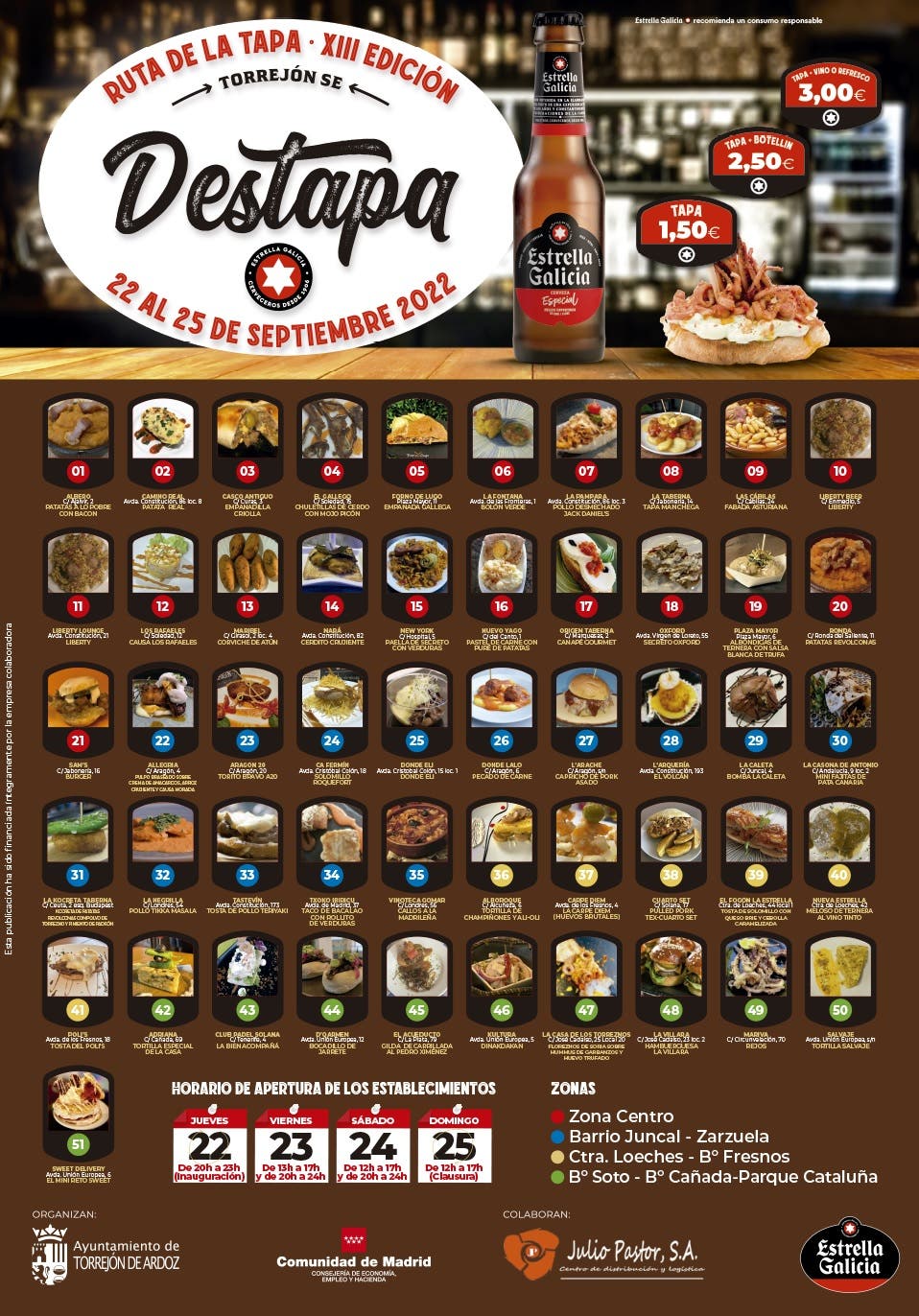 Durante estos días, Torrejón de Ardoz se convertirá en una gran fiesta de sabores y texturas con la Ruta de la Tapa que este año alcanza ya su décimo tercera edición y en la que se podrán degustar todo tipo de creaciones, desde las tapas más tradicionales hasta las más innovadoras y vanguardistas acompañadas por un botellín de cerveza por 2,50 euros; si se pide con vino o refresco por 3 euros; o degustar sólo la tapa por 1,50 euros. El patrocinador de la Ruta de la Tapa Torrejón se destapa será Estrella Galicia.