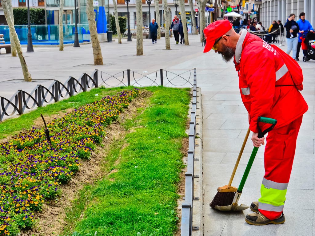 Cada operario va equipado, además del uniforme de color rojo, con un carrito, bolsas de basura, guantes, escobilla, pala y rastrillo.