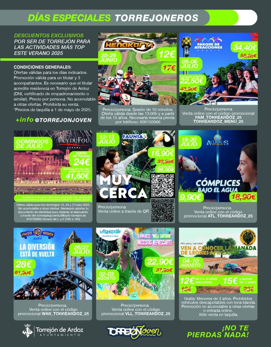 Todas las promociones son válidas para un titular y tres acompañantes. El titular debe acreditar que vive en Torrejón. Se puede presentar DNI o certificado de empadronamiento. Los precios son por persona y no son acumulables a otras ofertas.