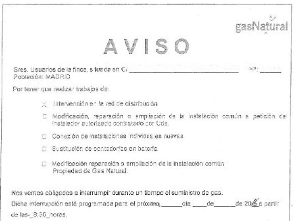 Según informa la Policía de Velilla, se ha tenido conocimiento de unos avisos depositados en los buzones de algunos domicilios de la localidad en los que se indica que, supuestamente, Gas Natural realizará en la red de distribución un corte de suministro, indicando fecha y hora.