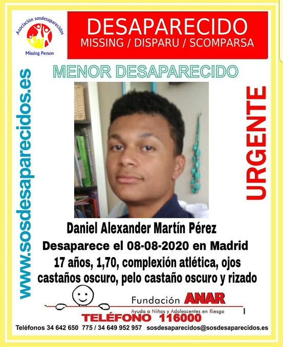 El tercer desaparecido es Daniel Alexander Martín Pérez, de 17 años. Mide 1,70 metros de altura, es de complexión atlética, tiene los ojos castaños claros, y el pelo rizado y castaño oscuro. También se fugó de forma voluntaria el martes y su familia no sabe dónde está, por lo que ha pedido colaboración ciudadana a través de la asociación SOS Desaparecidos.