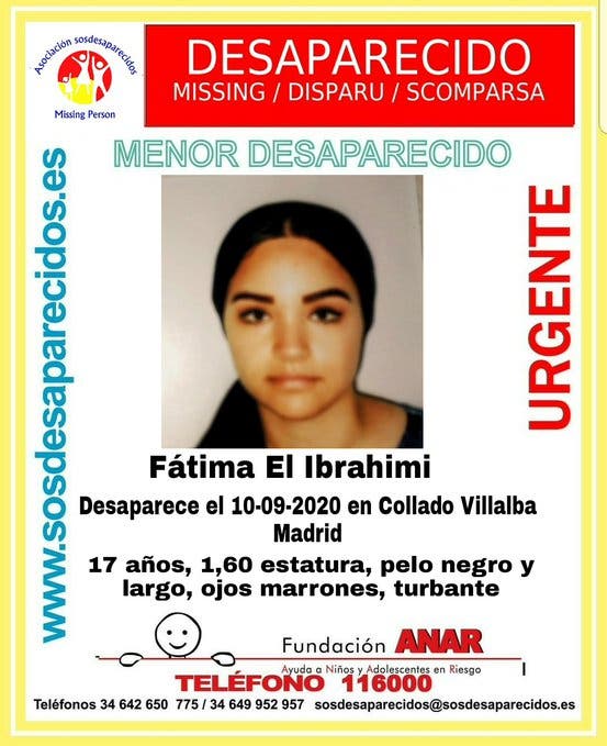 La segunda desaparición es la de Fatima El Ibrahimi, cuya pista se perdió el jueves cuando abandonó, sin dar aviso a su familia, la vivienda que compartía con ellos en Collado Villalba. La chica tiene 17 años, mide 1,60 metros de estatura, tiene el pelo negro y largo, ojos marrones y luce turbante.