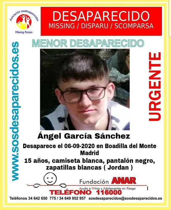 Se trata de Ángel García Sánchez, de 15 años, desaparecido en Boadilla del Monte el pasado domingo. Ese día vestía camiseta blanca, pantalón negro y zapatillas bancas tipo Jordan. Ya había huido de casa y se había refugiado en casa de amigos en otras ocasiones.