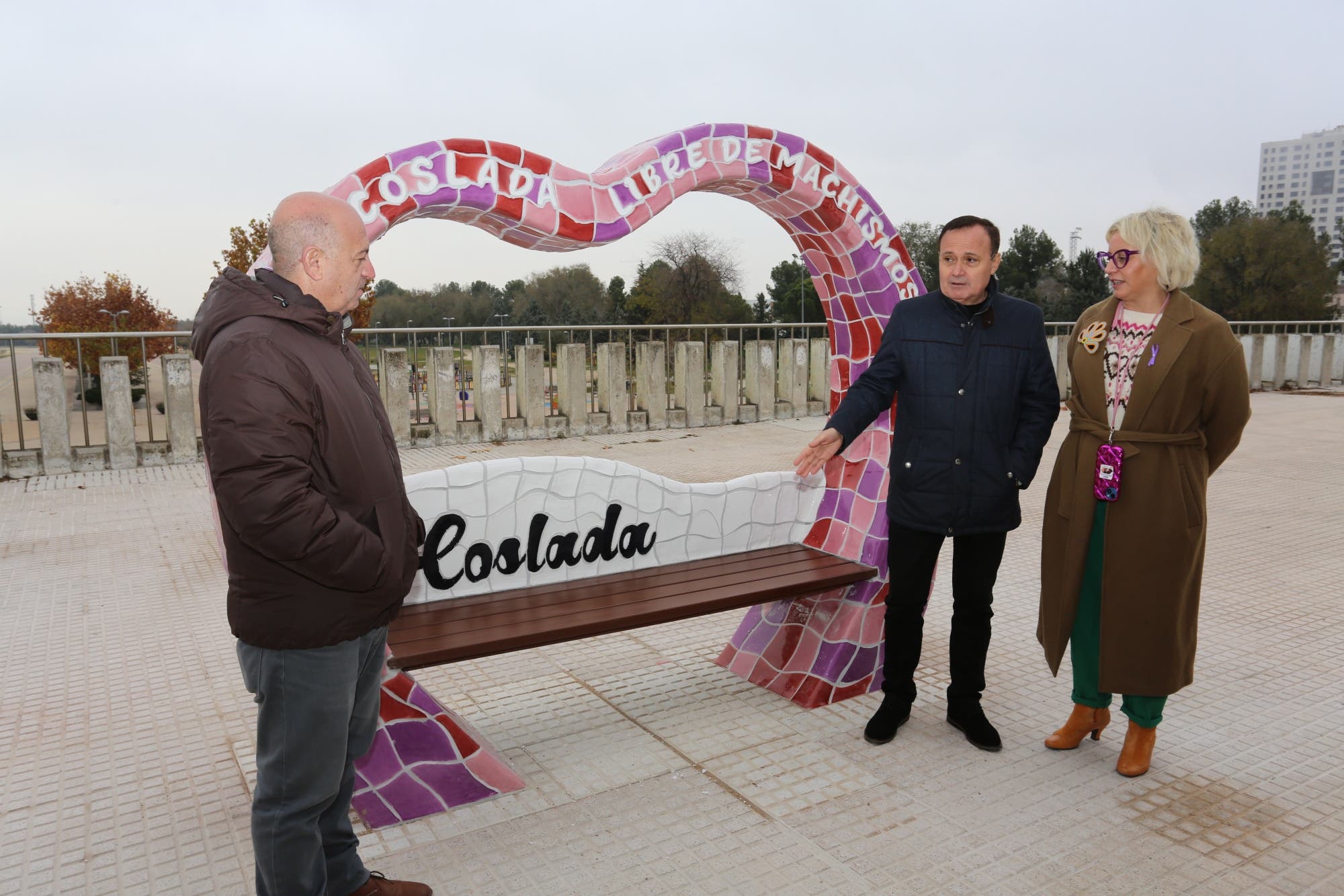 El alcalde de Coslada, Ángel Viveros, acompañado por la concejala delegada de Igualdad y Diversidad, Paz Garretas, y el edil delegado de Política Territorial, José Sousa, junto con buena parte del equipo de Gobierno han visitado hoy el nuevo «Banco por la Igualdad» que se ha instalado en la Plaza de la Rosa de los Vientos.
