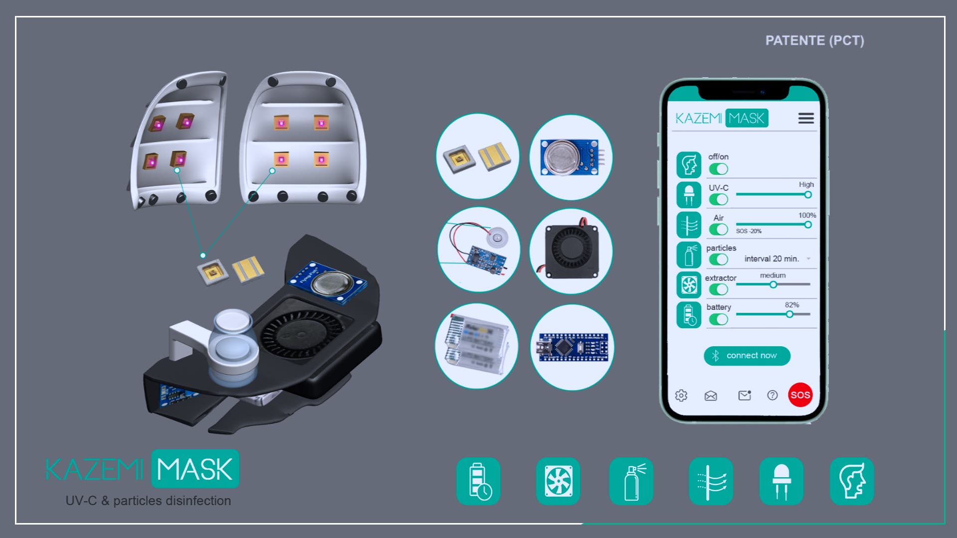Otra característica de la KazemiMask, «única mascarilla activa e inteligente del mundo en el momento de su registro», subraya su creador, es que cuenta con un sistema autodesmontable (con gran facilidad para la limpieza y desinfección), ligero, hermético, práctico (sus componentes son abatibles para ambientes de seguridad sin necesidad de tener que quitar la mascarilla) y sostenible (los elementos físicos empleados en su fabricación son reemplazables y no son dañinos para el usuario ni para los viandantes).