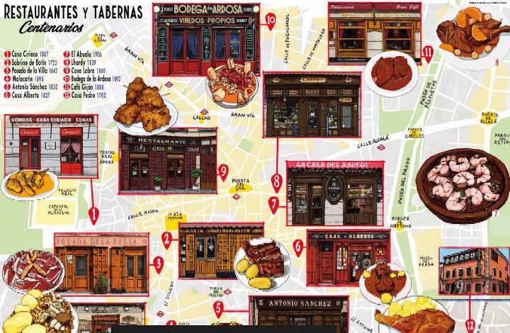 El Área de Cultura, Turismo y Deporte del Ayuntamiento de Madrid ha editado el mapa cultural ilustrado Restaurantes y tabernas centenarias de Madrid, con imágenes de Mario Jodra, ilustrador, diseñador y poeta zamorano que ha hecho de Madrid su casa. El historiador y crítico de arte, Juan Manuel Bonet, es el encargado de narrar la historia de cada establecimiento y sus especialidades.