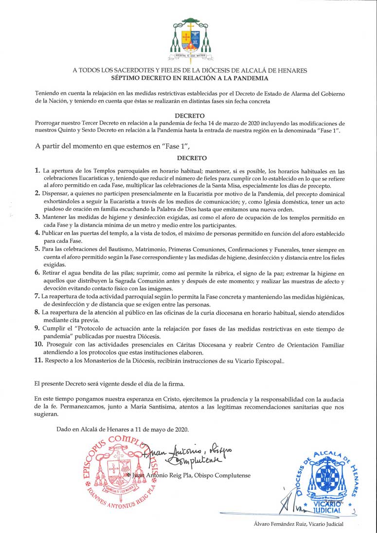 Por otro lado, el Obispado de Alcalá de Henares manifiesta su «agradecimiento a todos los sacerdotes y a cuantos colaboran con ellos por el servicio que vienen prestando desde el comienzo de la pandemia», así como a todos los fieles por «su conducta responsable y atenta a las necesidades de los más pobres a través de las redes de Cáritas e instituciones eclesiales», a los sanitarios de los distintos centros de salud por «su entrega y su servicio», y agradece «a los policías y cuerpos de seguridad su colaboración para que nuestros templos permanezcan abiertos y se asegure ordenadamente la celebración de los sacramentos».