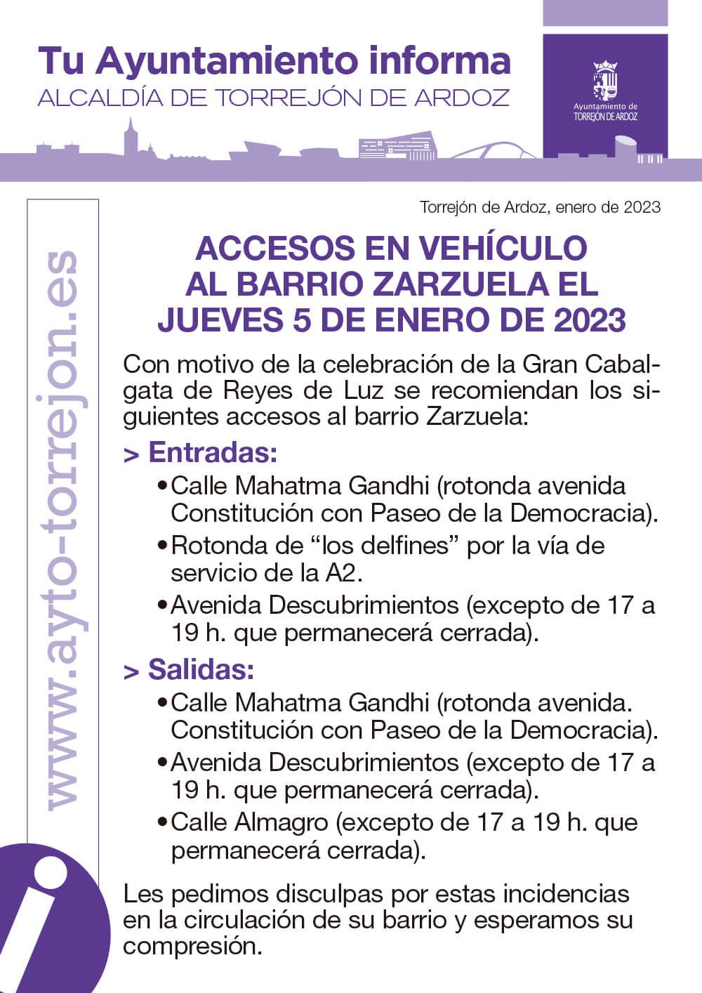– Consejos específicos sobre los accesos al barrio de Zarzuela, consultar el cartel que se publica a continuación.