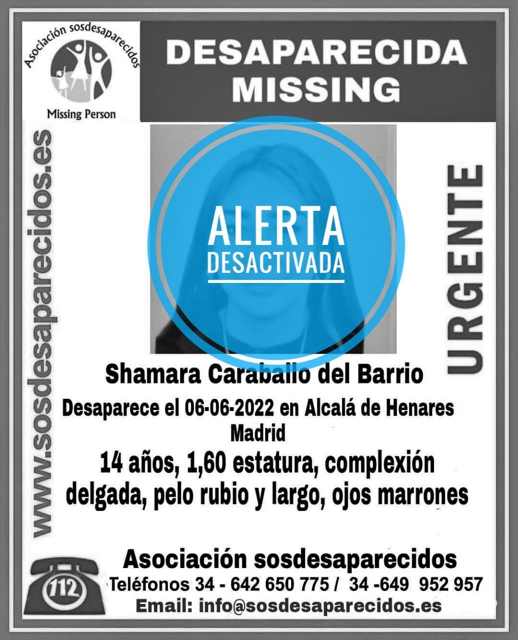 La joven de 14 años desaparecida desde el pasado 6 de junio en Alcalá de Henares ha sido localizada sana y salva, según ha confirmado su madre a través de las redes sociales. La asociación SOS Desaparecidos ya ha desactivado la alerta.