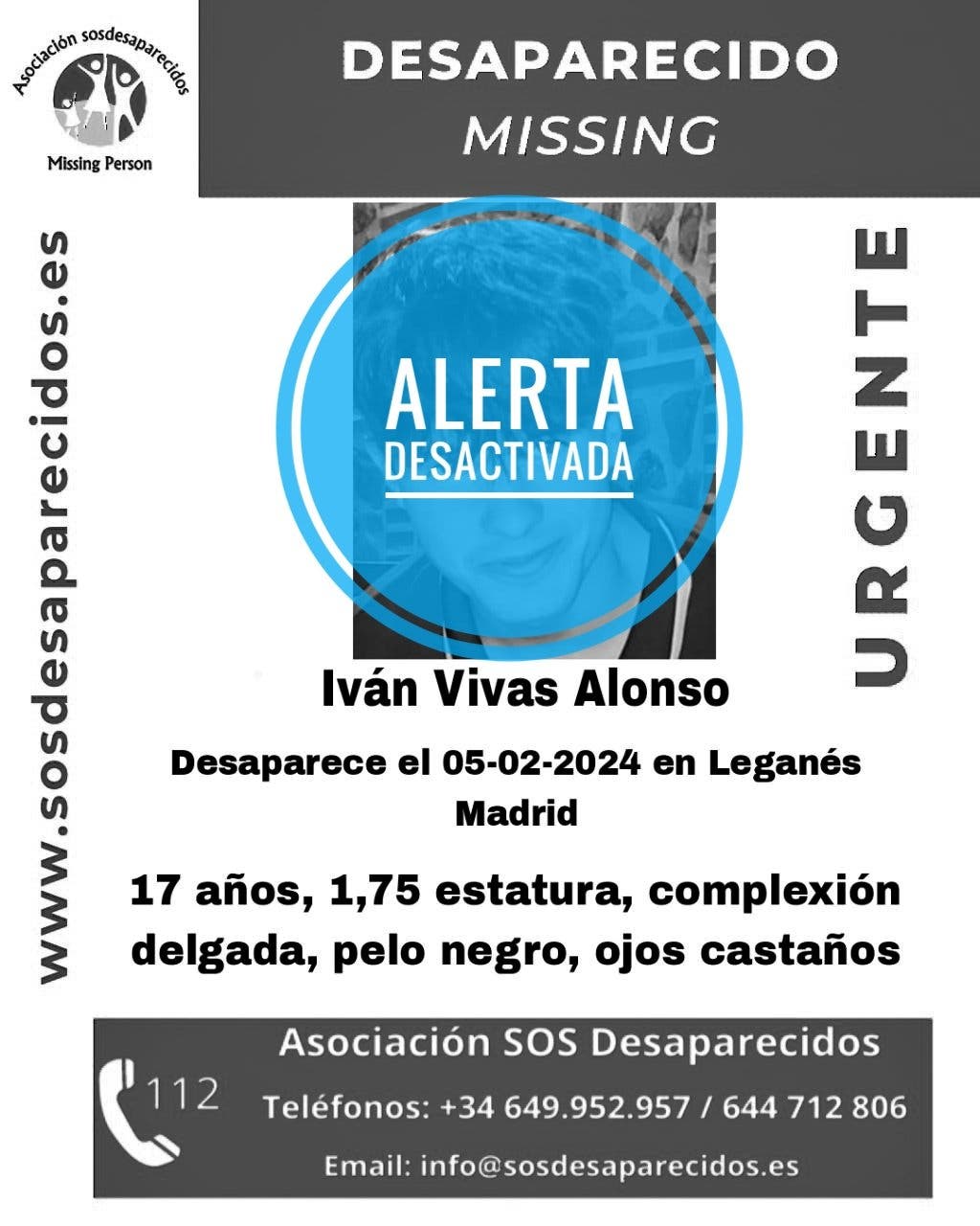 La asociación SOS Desaparecidos y el Ayuntamiento de Leganés han confirmado que a última hora de ayer fue localizado Iván, el joven de 17 años desaparecido el lunes, 5 de enero, cuando salió de casa para ir al instituto y no acudió a clase.