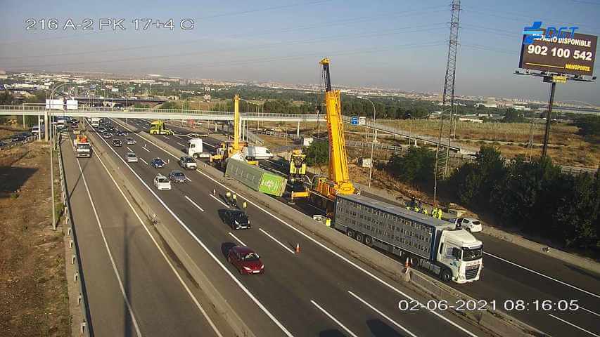 La Dirección General de Tráfico (DGT) ha informado de que poco antes de las 11 de la mañana de este martes, 2 de junio, ha quedado restablecido el tráfico en el tramo de la A-2 que permanecía cortado desde anoche por el vuelco de un camión que transportaba cerdos vivos.