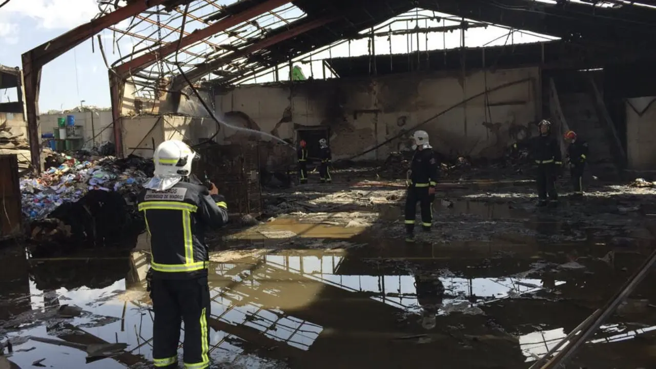 Los Bomberos de la Comunidad de Madrid continúan un día después trabajando en el incendio que ha calcinado por completo una nave industrial en un…