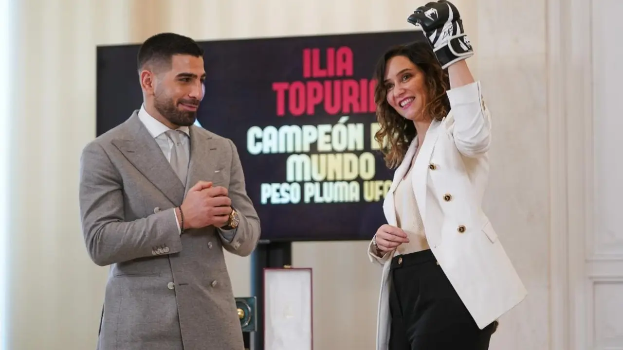 Ayuso recibe a Topuria: «El primer deportista que regala a España semejante triunfo» La presidenta madrileña ha rendido homenaje hoy a Ilia Topuria tras proclamarse campeón de MMA en la categoría de peso pluma. Redacción MiraCorredor 26/02/24