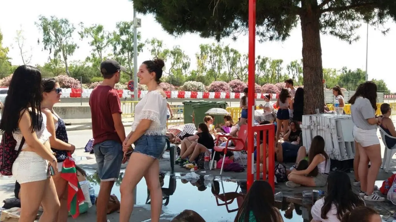 Haciendo cola desde primera hora para ver a Gemeliers en Torrejón Paraguas y manguerazos de las Peñas para soportar el calor. Redacción MiraCorredor 20/06/17